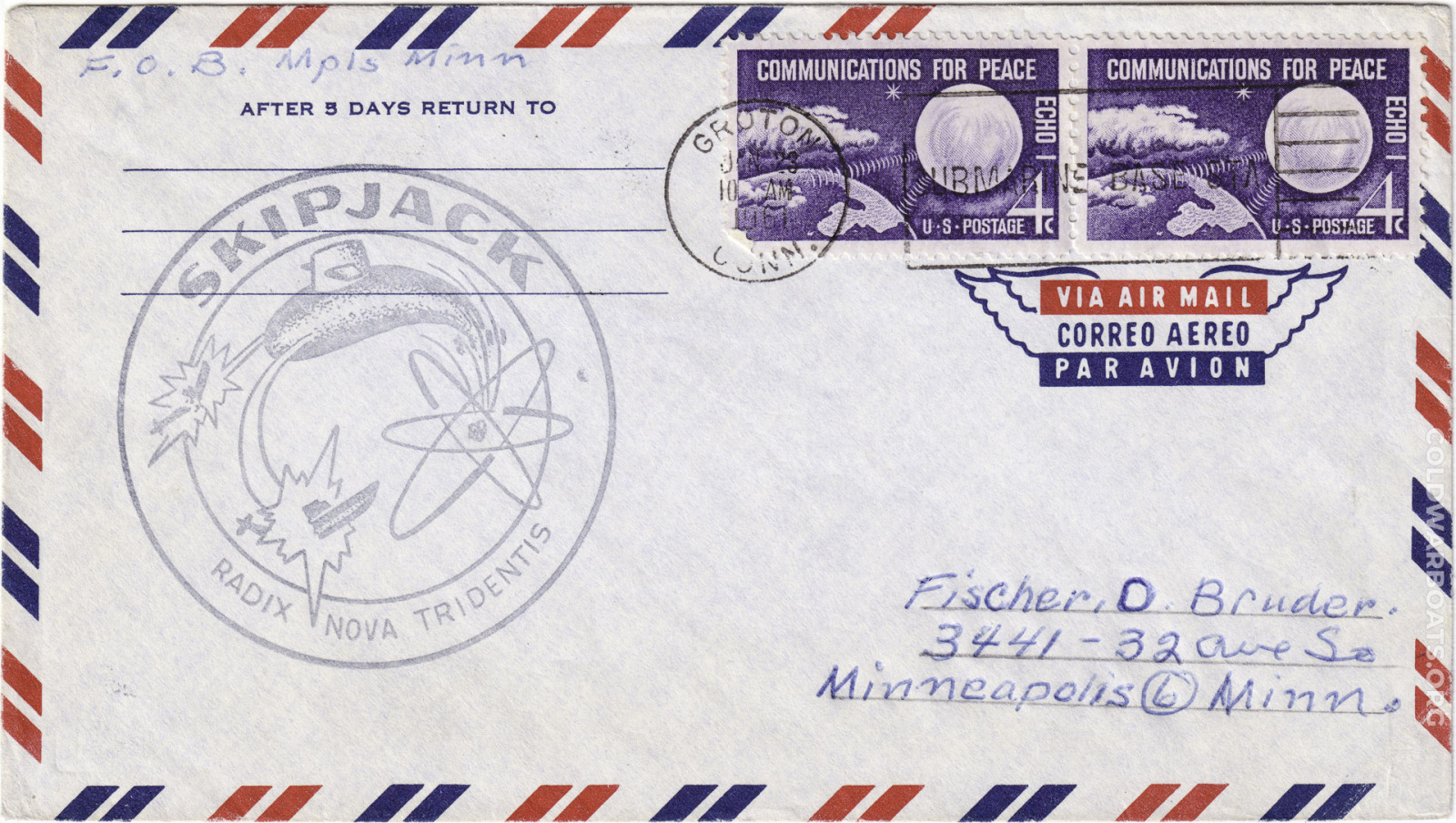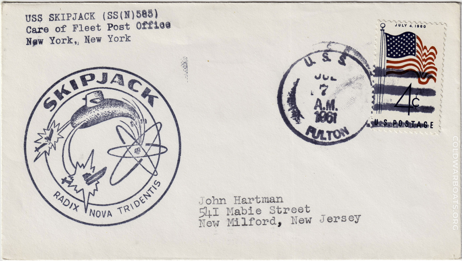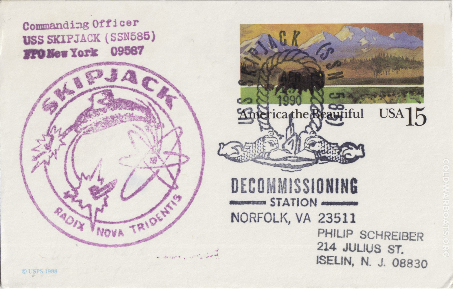 The USS SKIPJACK (SSN 585) has many commemorating such events as the launching, commissioning, decommissioning, and recycling. The boat also had, at several times, a rubber stamp that was applied to personal mail leaving through the ship's office.