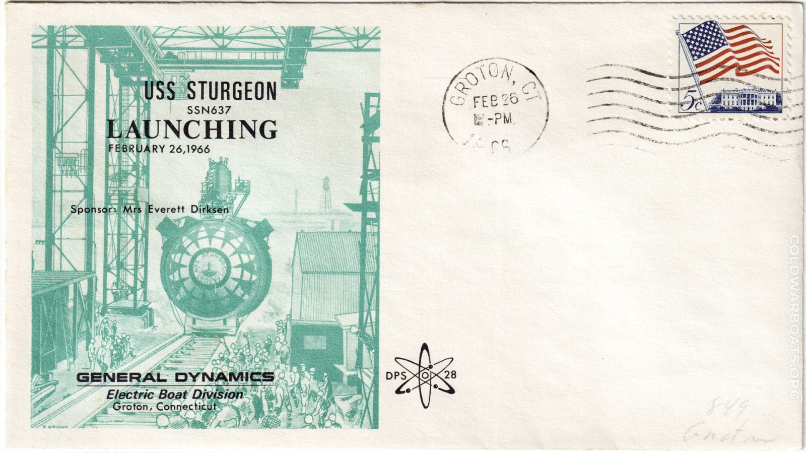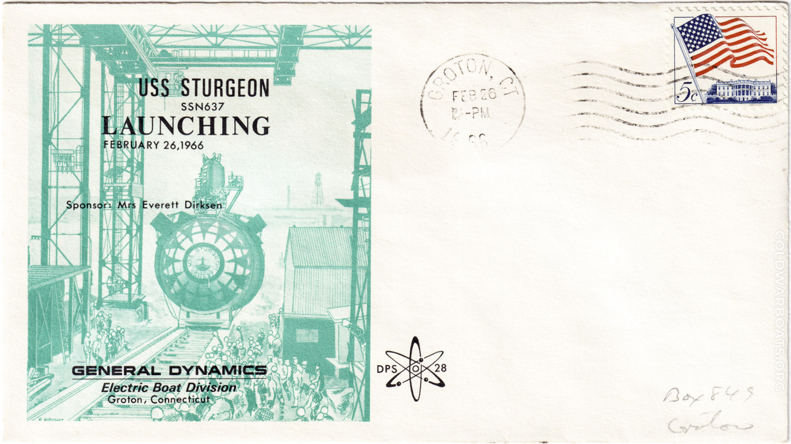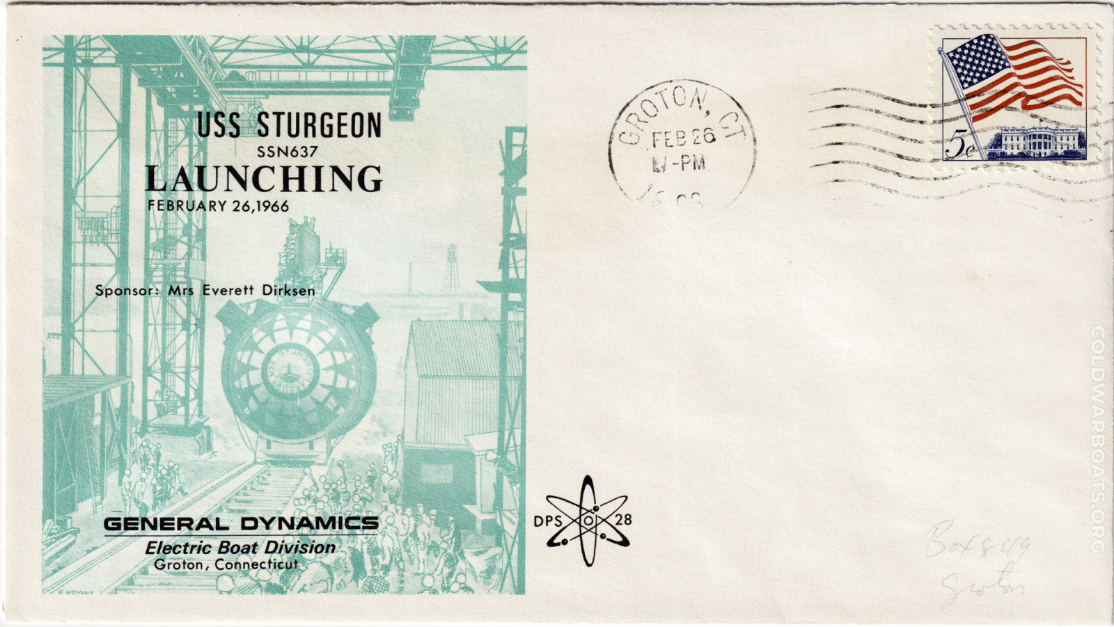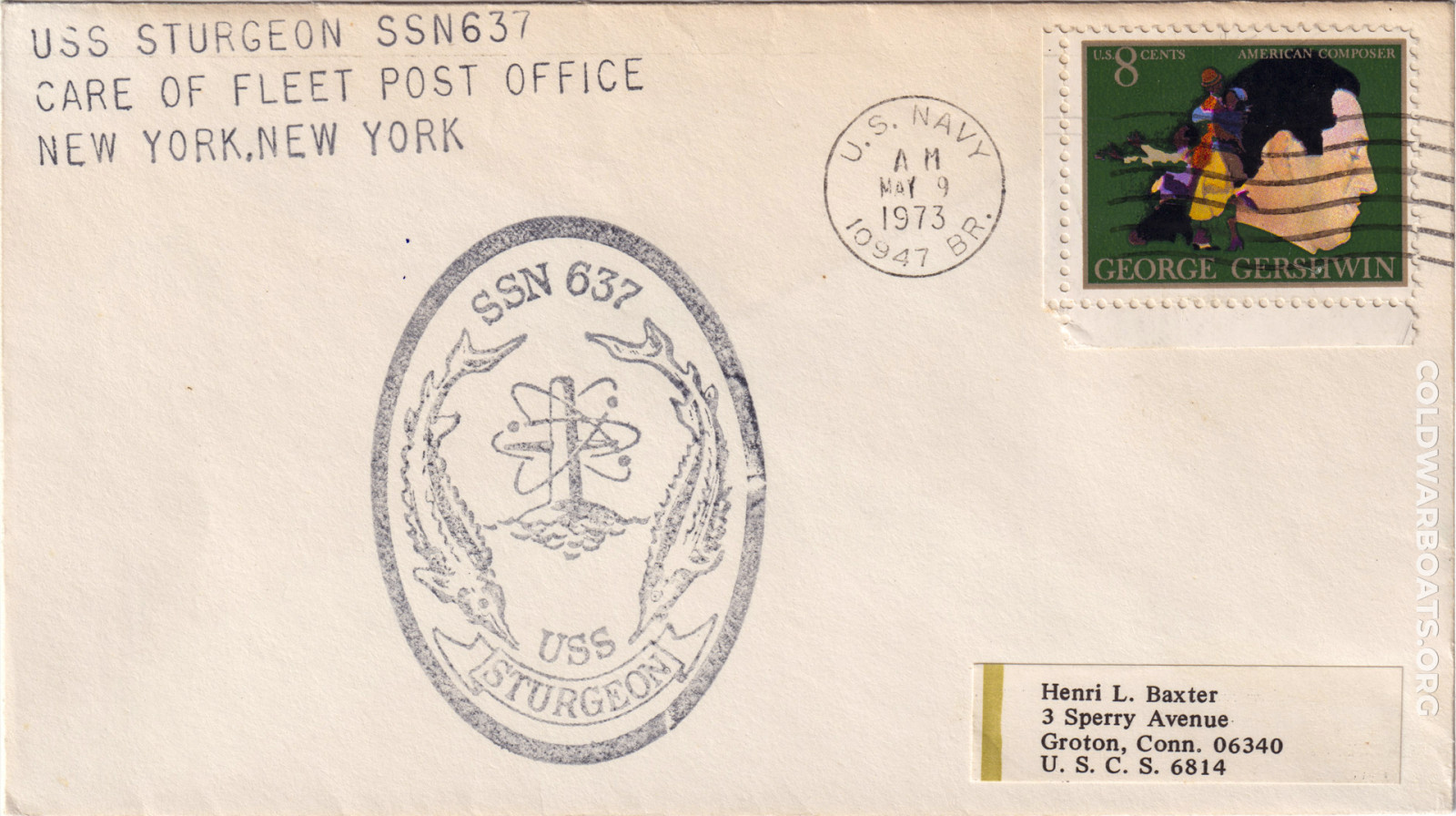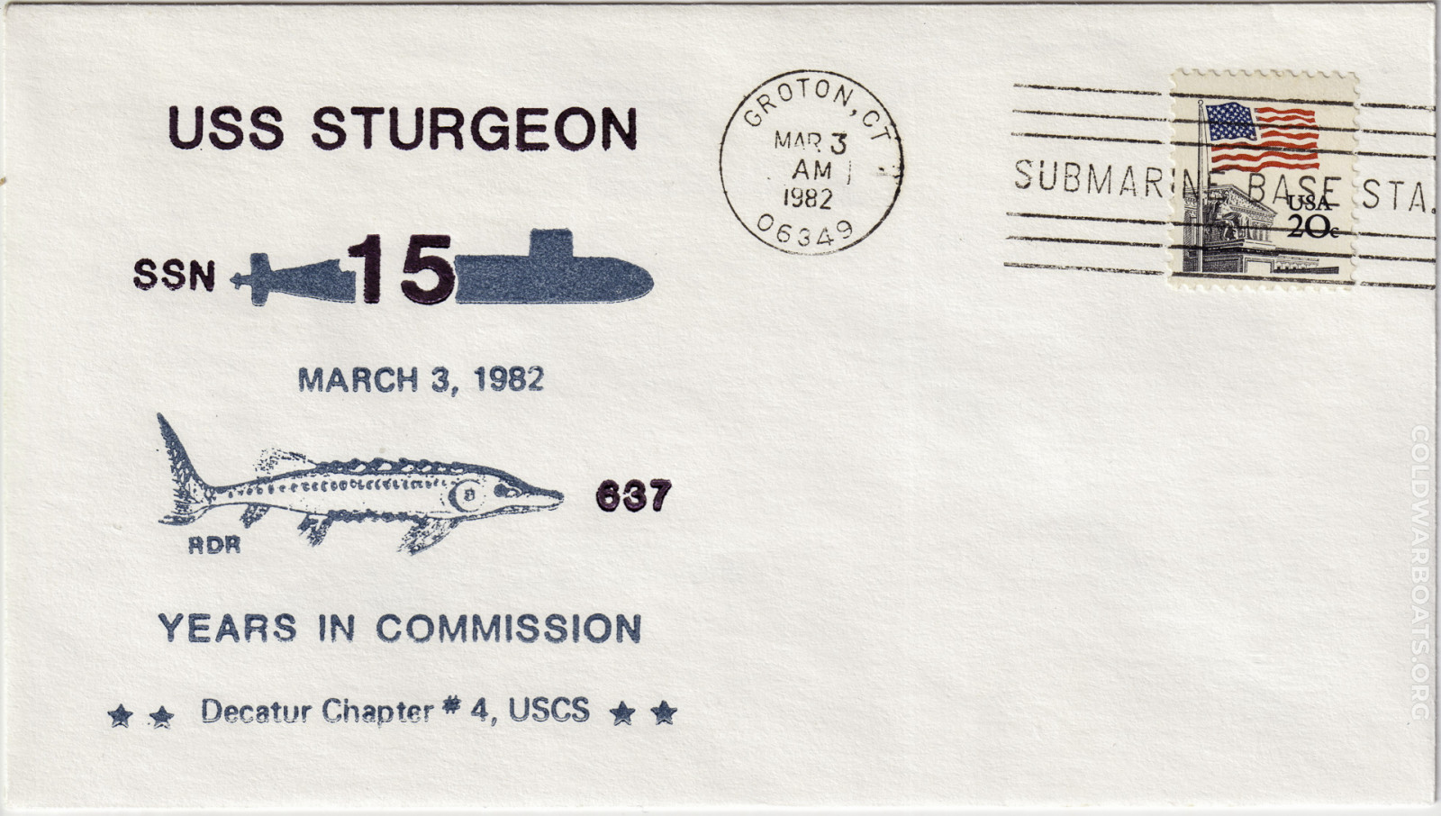 The USS STURGEON (SSN 637) has many commemorating such events as the launching, commissioning, decommissioning, and recycling. The boat also had, at several times, a rubber stamp that was applied to personal mail leaving through the ship's office.