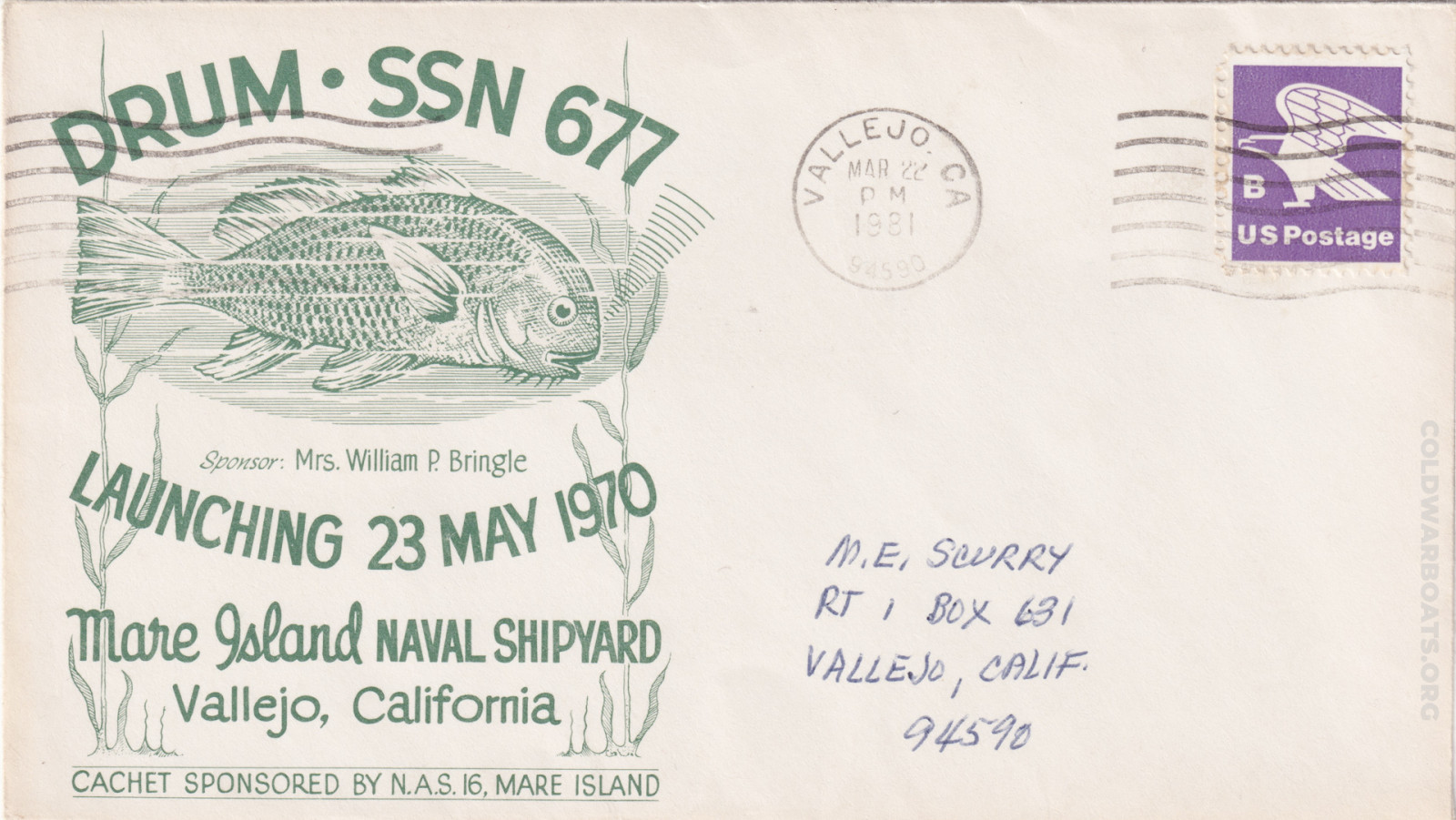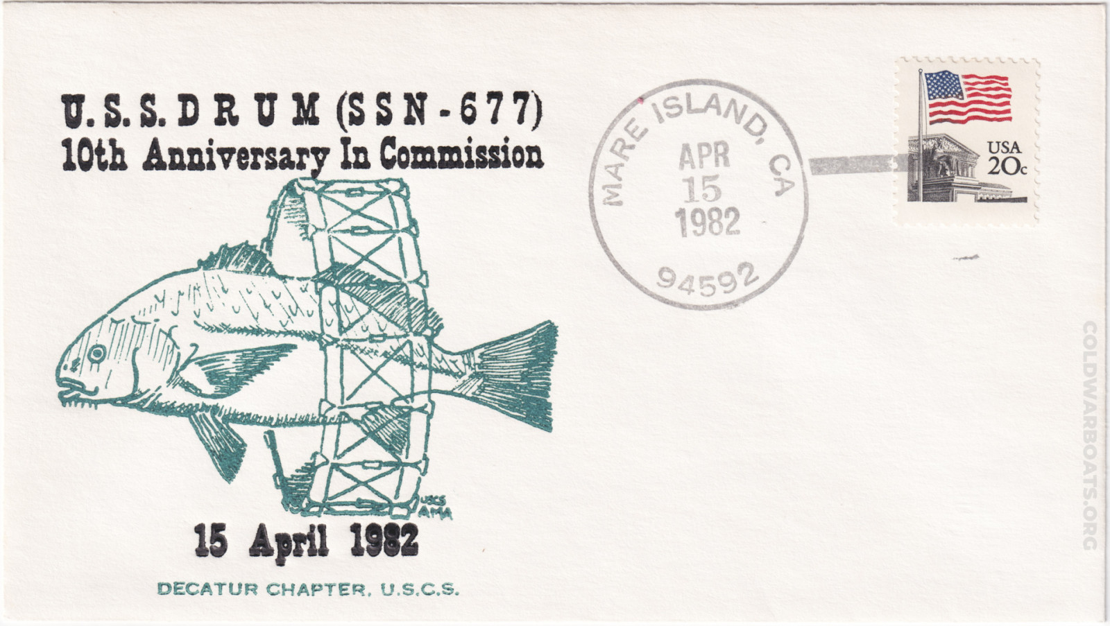 The USS DRUM (SSN 677) has many commemorating such events as the launching, commissioning, decommissioning, and recycling. The boat also had, at several times, a rubber stamp that was applied to personal mail leaving through the ship's office.