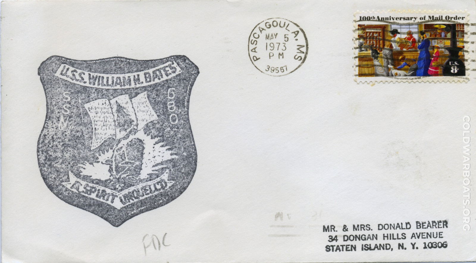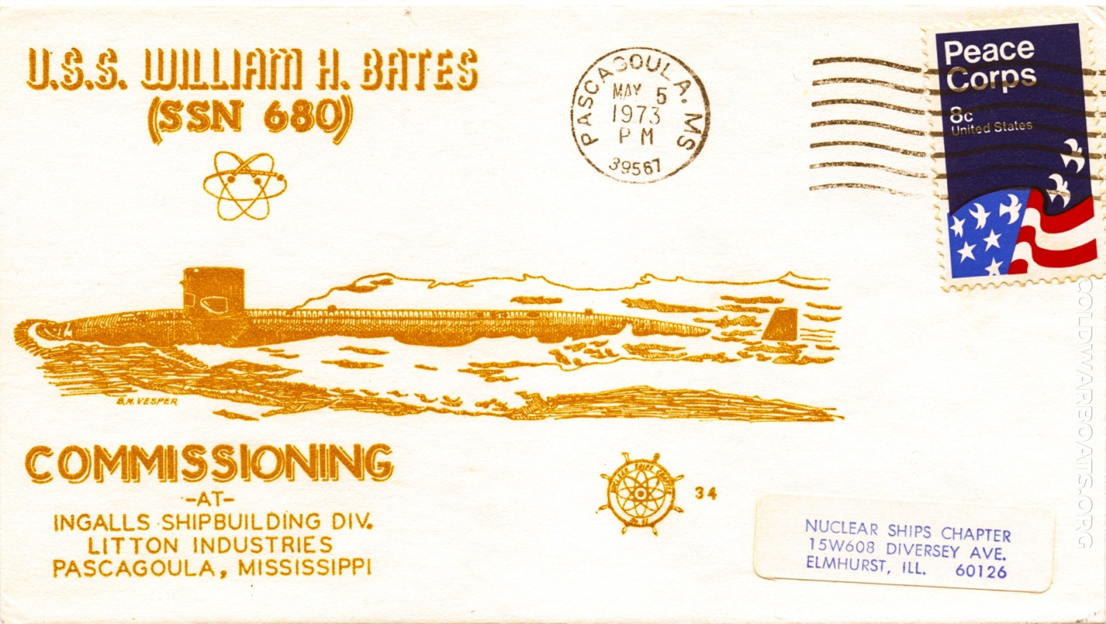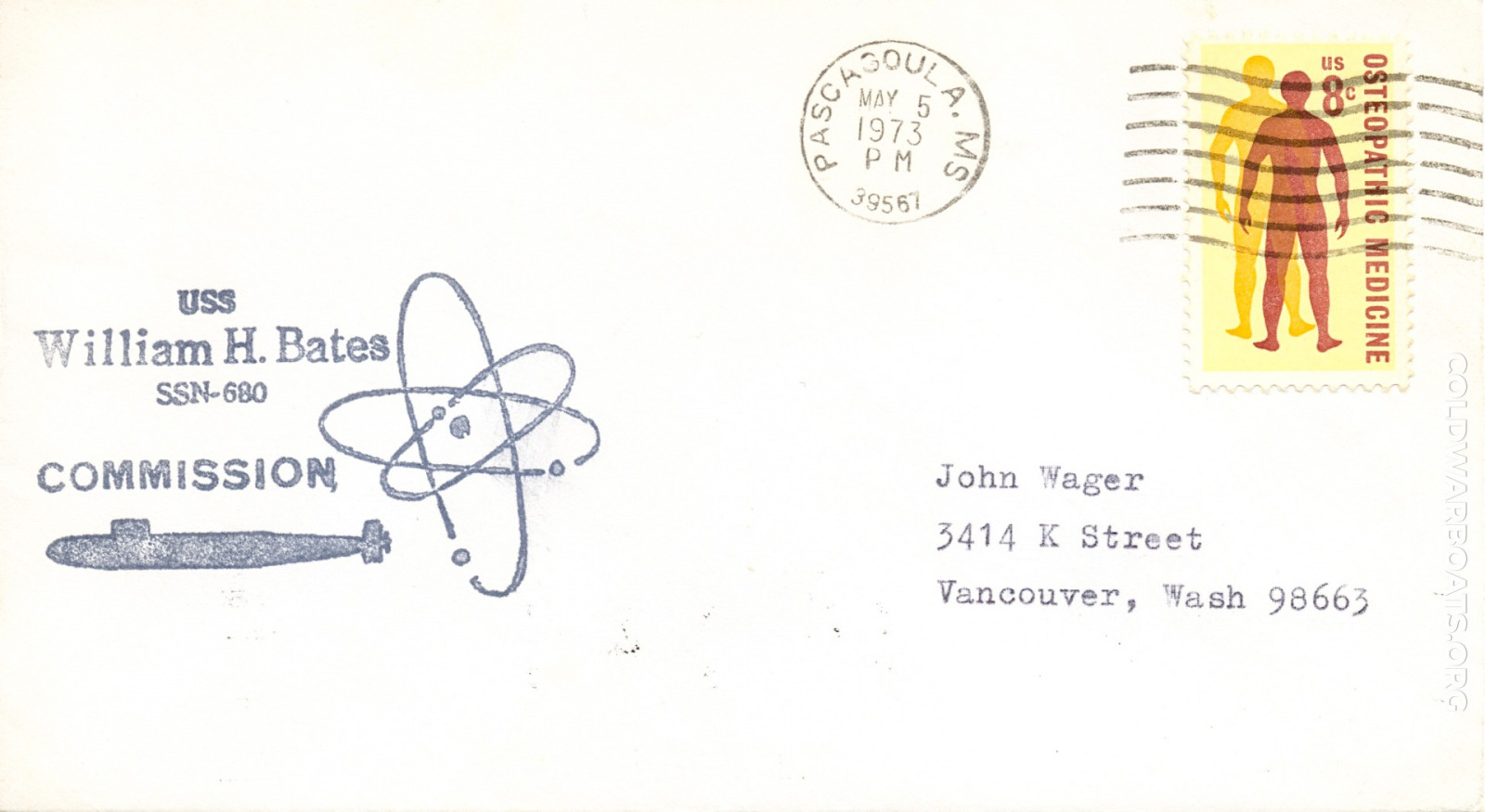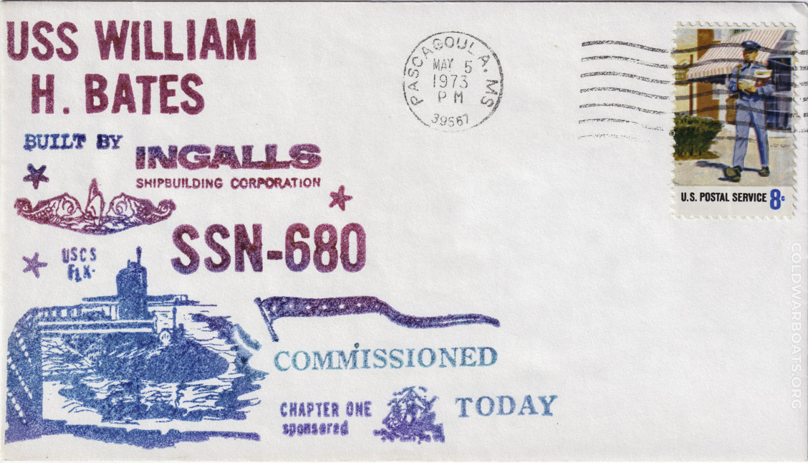 The USS WILLIAM H. BATES (SSN 680) has many commemorating such events as the launching, commissioning, decommissioning, and recycling. The boat also had, at several times, a rubber stamp that was applied to personal mail leaving through the ship's office.