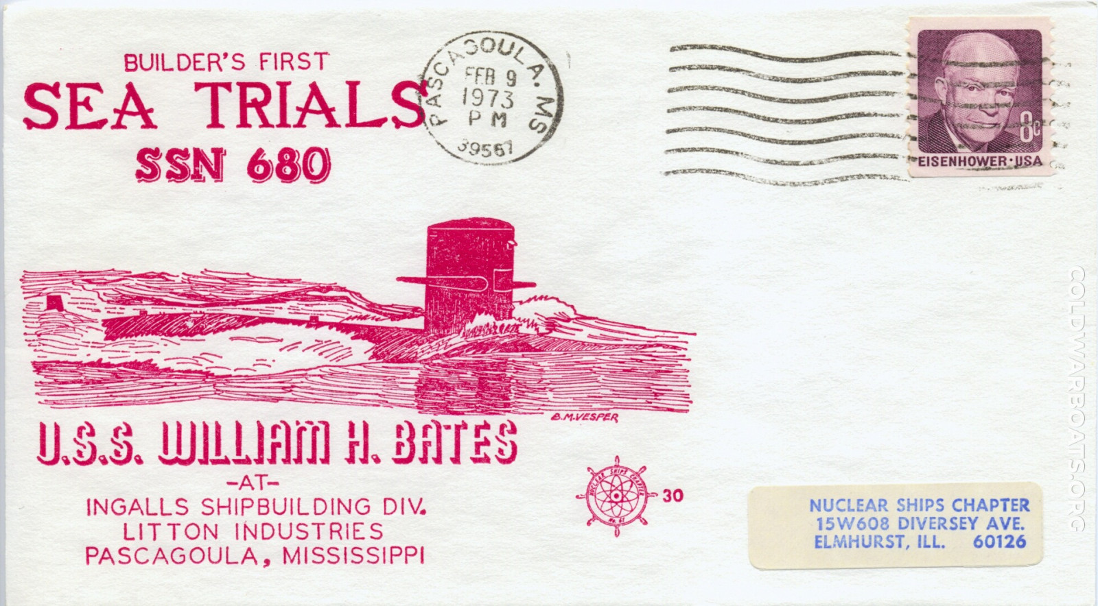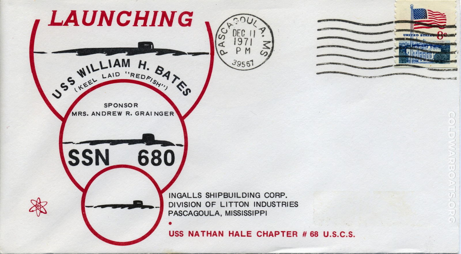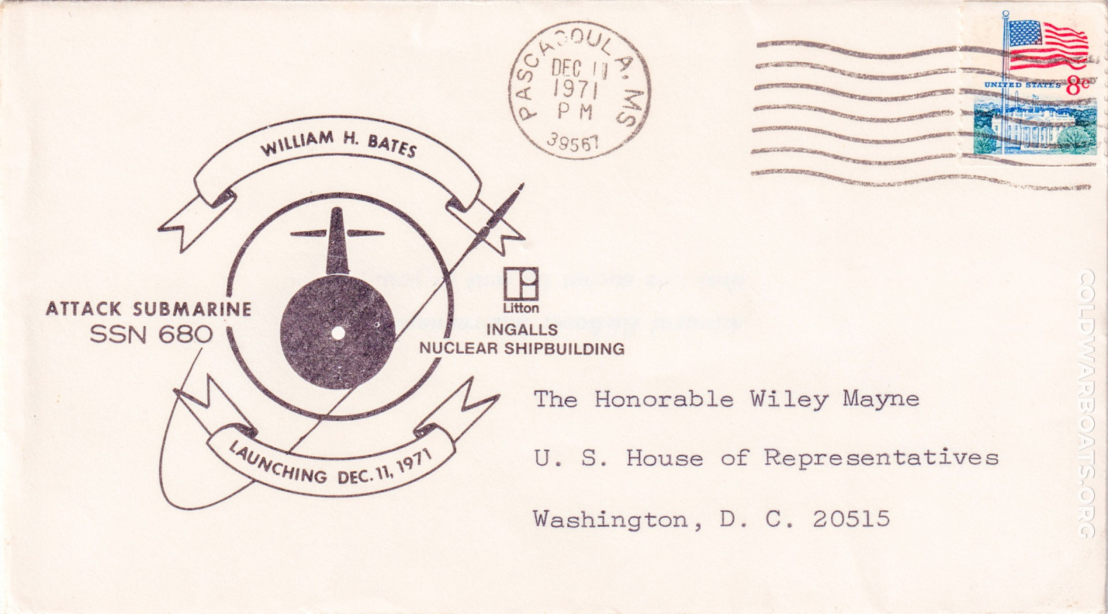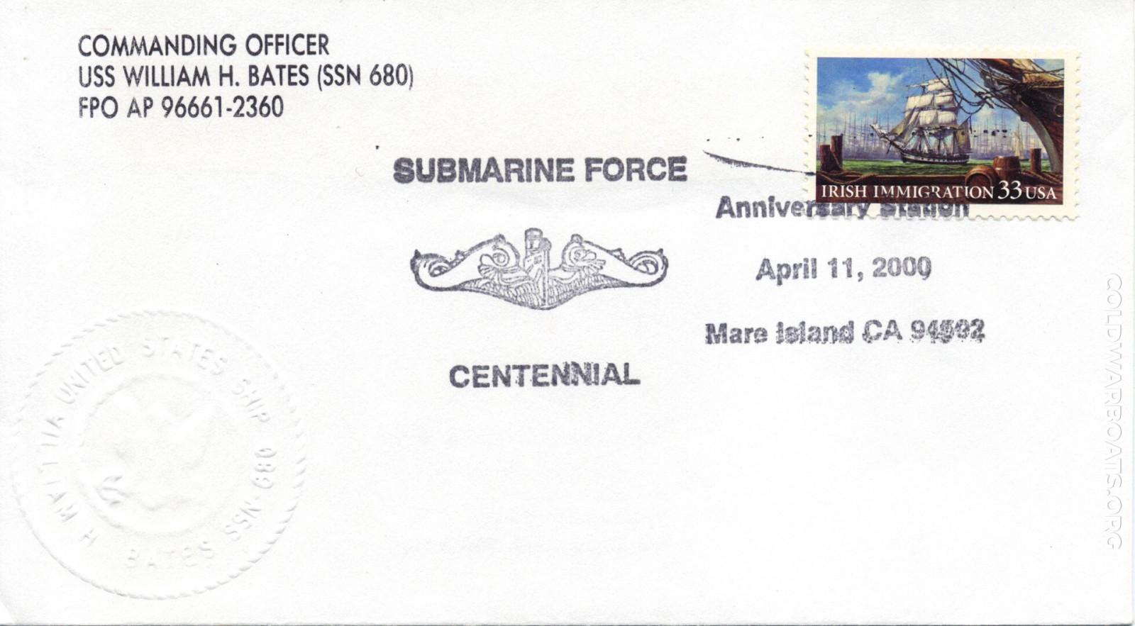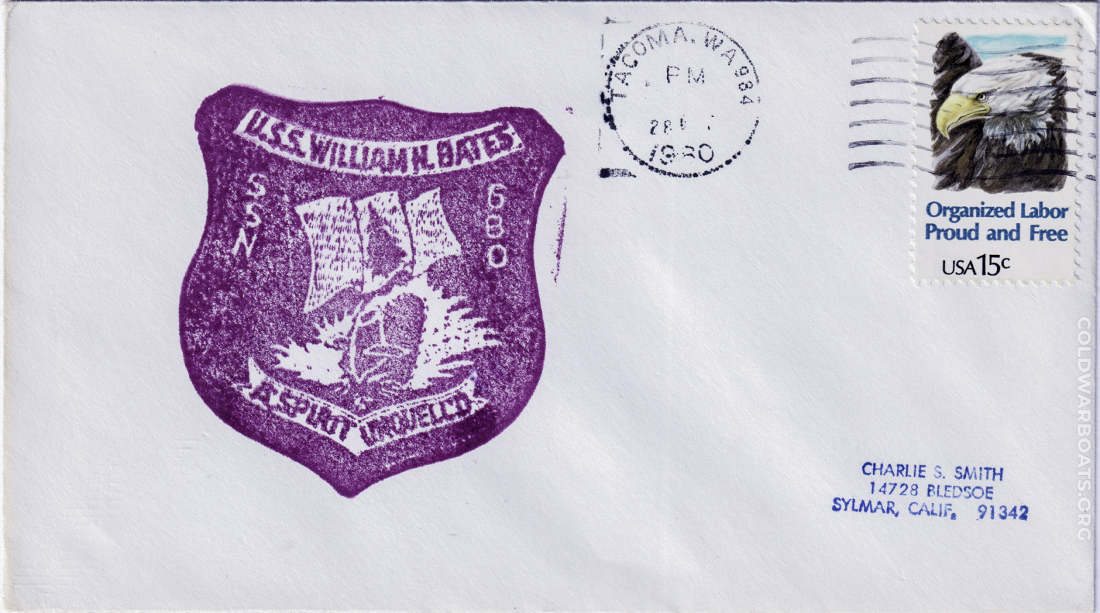 The USS WILLIAM H. BATES (SSN 680) has many commemorating such events as the launching, commissioning, decommissioning, and recycling. The boat also had, at several times, a rubber stamp that was applied to personal mail leaving through the ship's office.