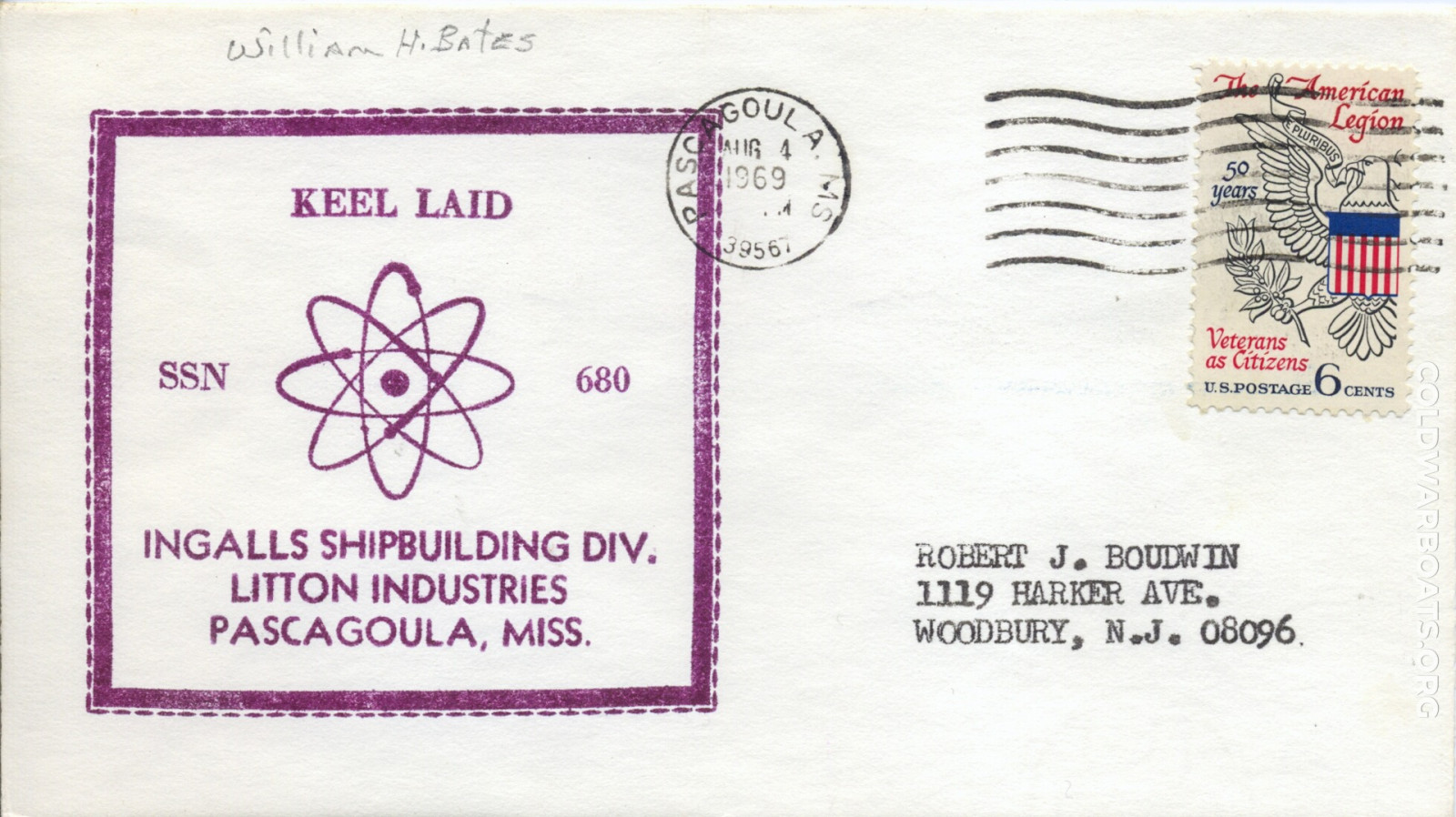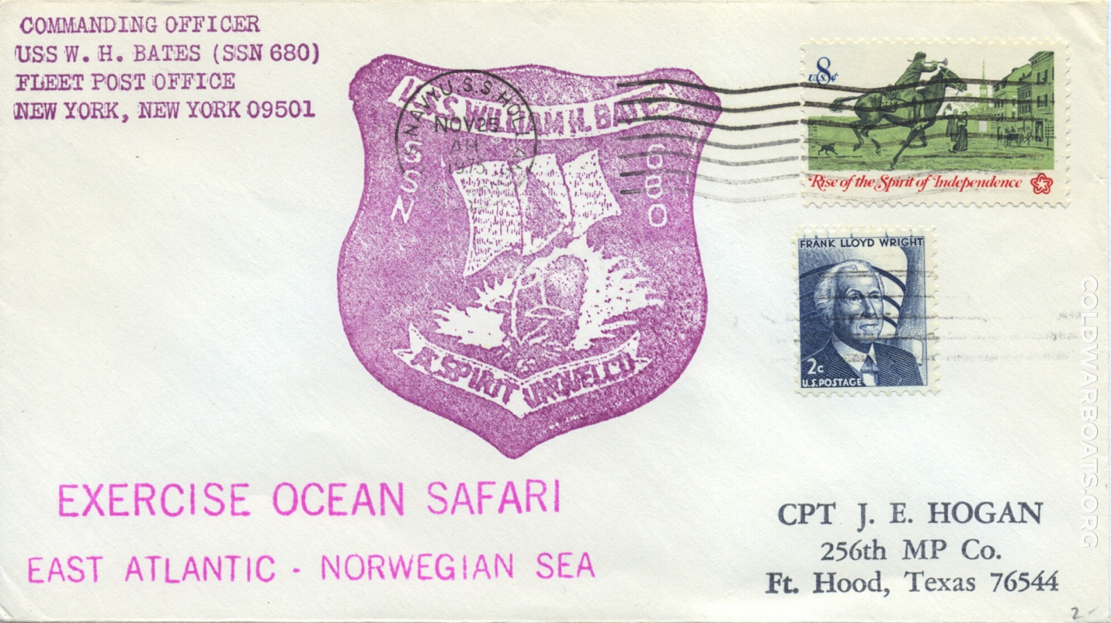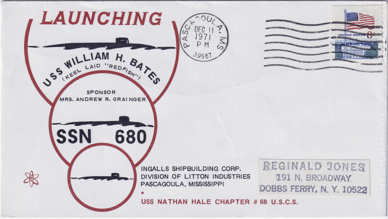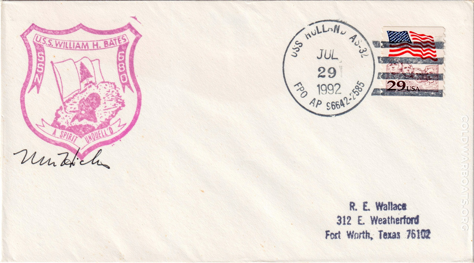 The USS WILLIAM H. BATES (SSN 680) has many commemorating such events as the launching, commissioning, decommissioning, and recycling. The boat also had, at several times, a rubber stamp that was applied to personal mail leaving through the ship's office.